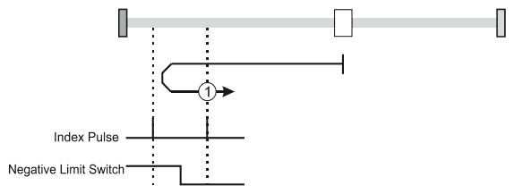 The motor starts using the “high speed” setting toward the selected limit switch. If the motor is already on the limit or after it is reached, the drive will reverse the motion, moving away from the limit with the “low speed” setting. The home position is finally set at the first index pulse encountered after the limit switch is becoming inactive. This homing mode can be configured to use either of the positive limit switch or negative limit switch (the drive will automatically handle the correct movement direction).
