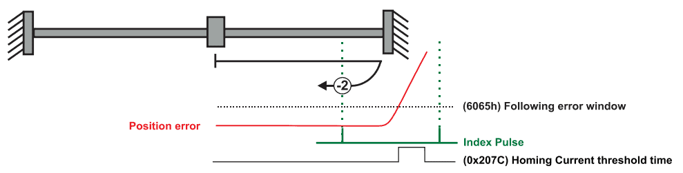 This method applies only to Stepper Open Loop with Encoder on motor or Encoder on Load. It does not apply to Closed loop configurations or Stepper Open Loop without an incremental encoder present. This homing method will detect a Position control error when reaching the mechanical limit. The rest of the homing method is identical to the previous case, only the way the mechanical limit is detected is changed because in case of open loop operation the motor current is always constant and not dependent on the position error.