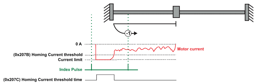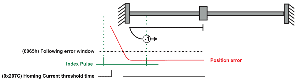 This method applies to all closed loop motor configurations. It does not apply to Stepper Open Loop configurations. The motor will start to move in the selected direction until the “Current threshold” is reached for a specified amount of time. This relies on the controller response to the ever increasing position error (the motor will be standing, pushing against the limit, while the reference will continue to increase) – the drive will increase the motor torque in an effort to reduce the position error. When the mechanical limit is found in this way, the motor will reverse and stop at the first index pulse, where the home position will be set.
