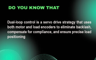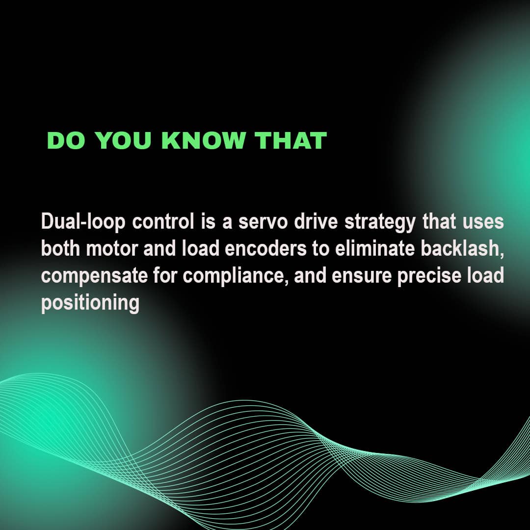 Dual-loop control is a servo drive strategy that uses both motor and load encoders to eliminate backlash, compensate for compliance, and ensure precise load positioning