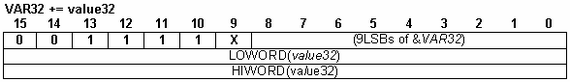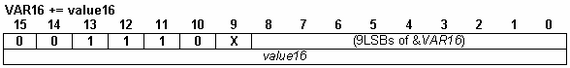 | Description | Adds a 16-bit / 32-bit immediate value or the value of the 16-bit / 32-bit source variable to the 16-bit / 32-bit destination variable. The instructions use a 9-bit short address for the destination variable. Bit value X specifies the destination address range: |