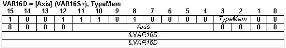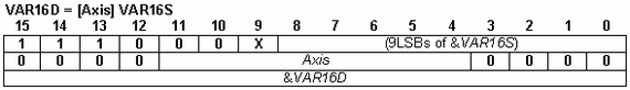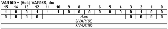 Operands VAR16x: integer variable VAR16x Axis: an integer 1 to 255 representing the Axis ID of the source axis DM: data memory operand TypeMem: memory operand. One of dm (0x1), pm (0x0) or spi (0x2) values (VAR16x): contents of variable VAR16x, representing a 16-bit address of a variable